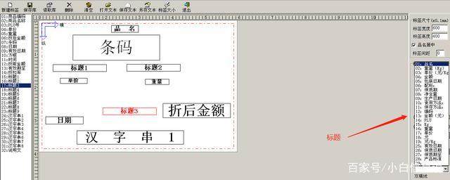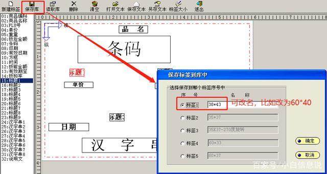 (2)首先在右側上部設置紙張大小,我這(zhè)裡(lǐ)是60*40mm的。雙擊左側字段(如品名、條碼等)或單擊拖動到标簽區域内。右側可設置每個字段的字體大小、打印方向(xiàng),每個字段的位置可以使用鼠标來拖動。如果是空白标簽,我們可以使用标題來充當每個字段的标題,右側可定義該标題的含義,如單價、重量、金額等。漢字串一般用來展示店名,需要在漢字串中設置具體内容。完成(chéng)後(hòu)保存庫即可
