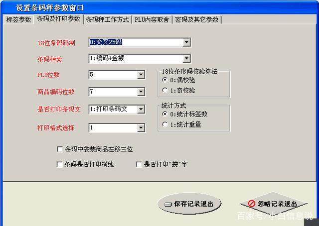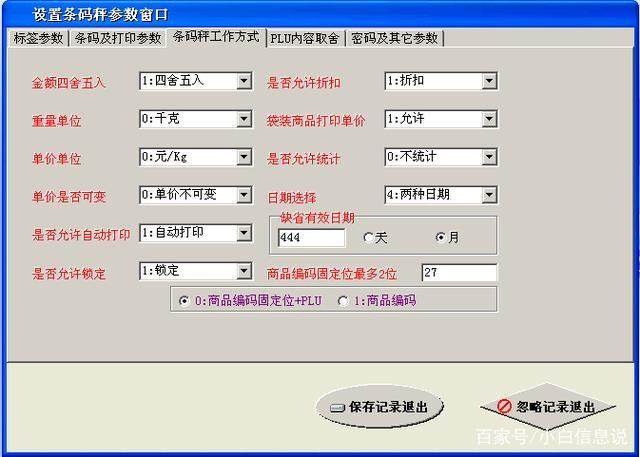 (3)條碼秤工作方式:一般選項直接默認即可。注意商品編碼固定位,要與收銀軟件中一緻,比如:21/22/23/27等;是商品編碼固定位(即前述21/22/23/27)+PLU還(hái)是僅商品編碼。如13位金額碼組成(chéng)規則:2位起(qǐ)始标志位+5位PLU+5位金額+1位校驗碼;18位重量金額條碼組成(chéng)規則:2位起(qǐ)始标志位+5位PLU+5位重量+5位金額+1位校驗碼。13位碼重量由金額/單價反算,會(huì)導緻庫存不準;18位碼則金額/重量反算單價。