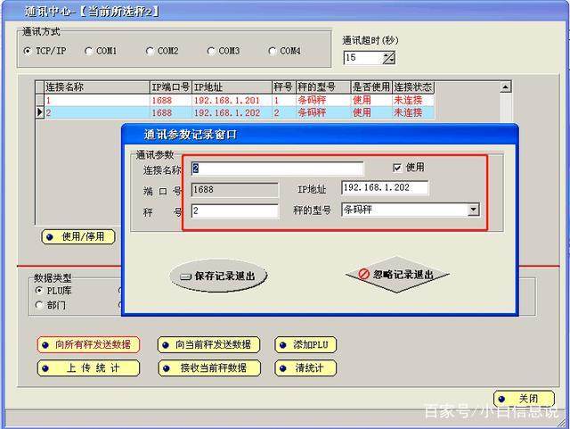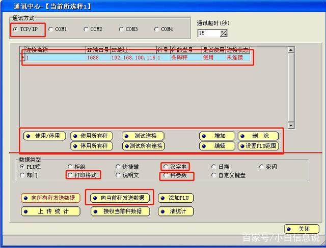 (1)通訊方式選“TCP/IP”,可編輯或增加秤信息,可測試連接秤網絡是否通訊,一般下傳漢字串、打印格式、秤參數3個選項即可,選中1個“向(xiàng)當前秤發(fā)送”,再發(fā)送下一個。
